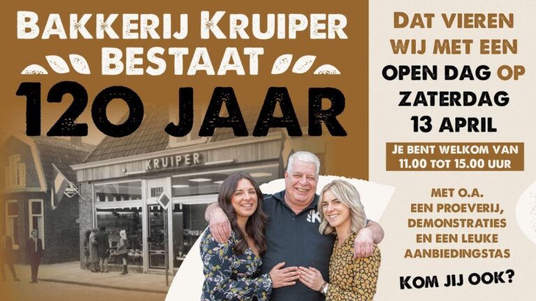 Al 120 jaar is Bakkerij Kruiper te vinden aan de Hoofdstraat Oost 38 in Wolvega. Eduard Kruiper, opa van de huidige Eduard Kruiper, begon de bakkerij in 1904. Inmiddels is alweer de vierde generatie Kruiper aan de slag in de bakkerij. Om het 120-jarig bestaan te vieren zijn er het hele jaar leuke acties en activiteiten. Te beginnen met een open dag komende zaterdag 13 april, met onder andere demonstraties en een chocoladefontein.