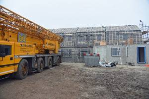 Wolvega – Op dinsdagmiddag 20 december werd het hoogste punt bereikt van de bouw van een blok woningen van de Woningstichting Weststellingwerf aan de Haulerweg in Wolvega. Om dit tot uiting te brengen is een kerstboom op het dak geplaatst en een banner met een nieuwjaarsgroet. Het is het eerste blok van twee met totaal acht huurwoningen, zes gezinswoningen en twee levensloopbestendige woningen. Om de parkeerdruk op de Haulerweg te verlichten wordt achter de woningen een parkeergelegenheid aangelegd. Bouwbedrijf Bakker uit Oldelamer bouwt de woningen met hoogwaardige isolatie en volgens planning is de oplevering in juni en de sleuteluitgifte na de zomervakantie. Na ruim 100 jaar dienst te hebben gedaan waren de 10 oorspronkelijke en inmiddels dus gesloopte woningen niet meer van deze tijd.