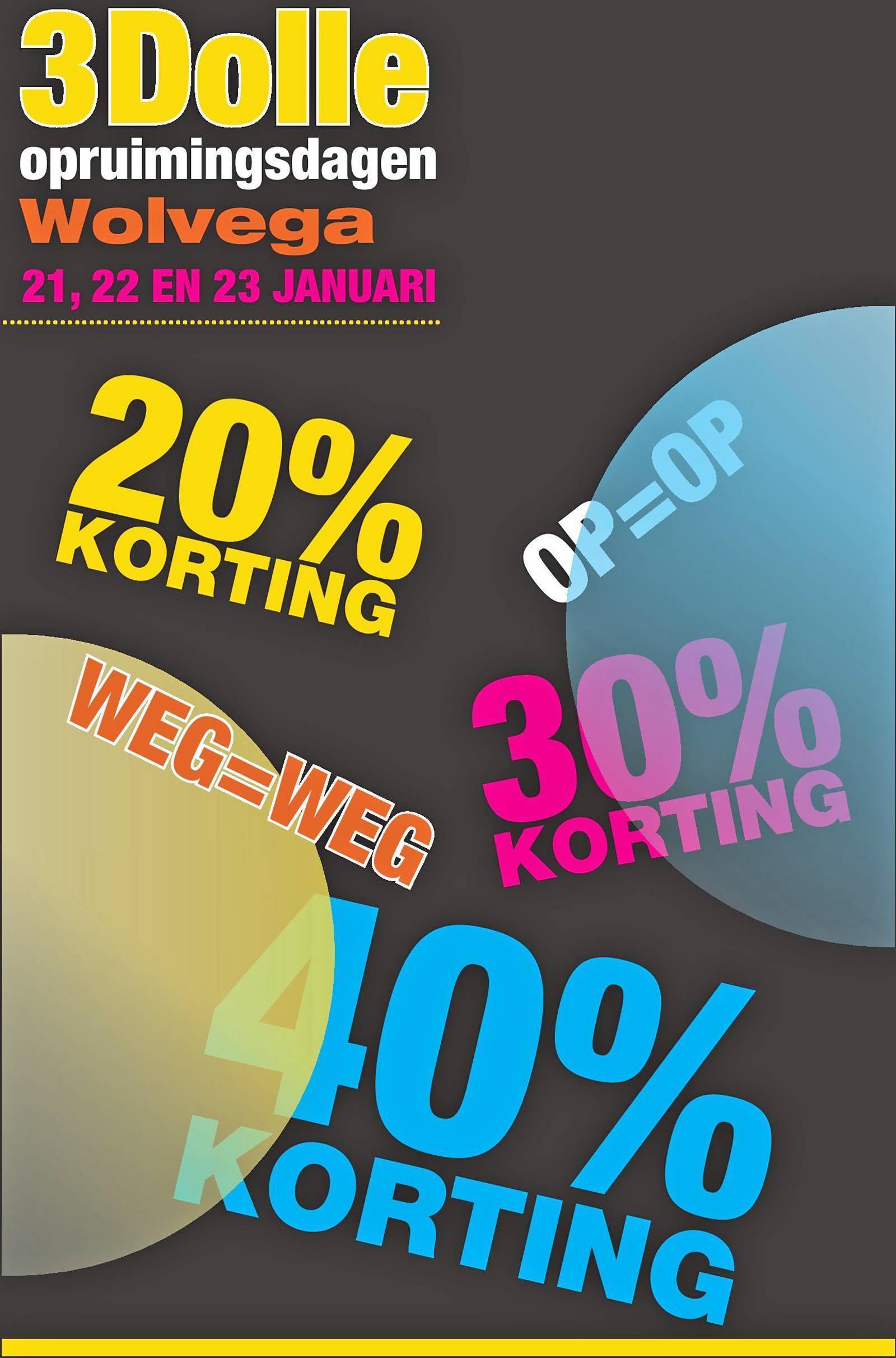 Konden er de afgelopen weken al volop koopjes gescoord worden in de Wolvegaster winkelstraat, tijdens de Drie Dolle Dagen bereikt de uitverkoop een hoogtepunt en zijn kortingen van zeventig procent geen uitzondering meer! De winkeliers willen graag in hun winkels plaats hebben voor de voorjaarsmode en daarom moeten de wintertruien, -laarzen, -tassen en -jassen nu écht weg. Dat betekent leuke spullen voor heel weinig geld en dat komt goed van pas in deze tijd. Een mooie gelegenheid om lekker in te slaan, nu de winter nog lang niet voorbij is.