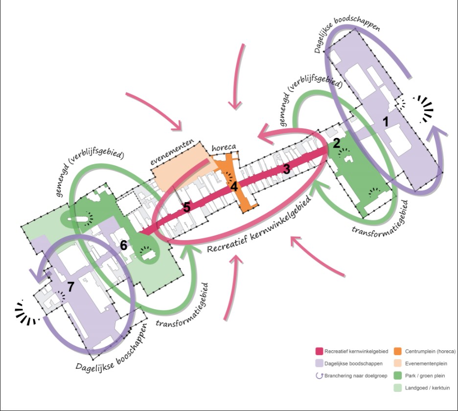 - Sfeergebieden Om het centrum compacter te maken, wordt het centrum opgedeeld in vijf sfeergebieden. In het midden van het centrum staan de horeca en de detailhandel centraal. De uiteinden van het centrum, met de supermarkten, blijven zoals nu ingericht als gebieden voor de dagelijkse boodschappen. Uit onderzoek blijkt dat mensen vaak en van ver komen naar Wolvega om hun boodschappen te doen. De gemeente wil dit behouden en versterken door de bereikbaarheid te verbeteren. Tussen de boodschappengebieden en het kernwinkelgebied komen gemengde (verblijfs)gebieden. Hier is ruimte voor winkels, horeca, kantoren, wonen en evenementen.