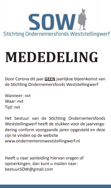Door corona wordt er dit jaar geen jaarvergadering vanuit de SOW georganiseerd.