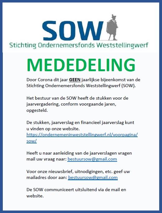 Door corona wordt er ook dit jaar geen jaarvergadering vanuit de SOW georganiseerd.